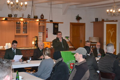 Kreisjägermeister Helge John berichtete u.a. von der beklagenswerten genetischen Verarmung des Rotwildes aufgrund zunehmender Fragmentierung seines Lebensraumes sowie von den ökologischen Herausforderungen durch den starken Anstieg der Waschbärpopulation. Als erfreuliche Entwicklung konnte John von der zunehmenden Wiederverbreitung des Bibers in unseren heimischen Revieren berichten.